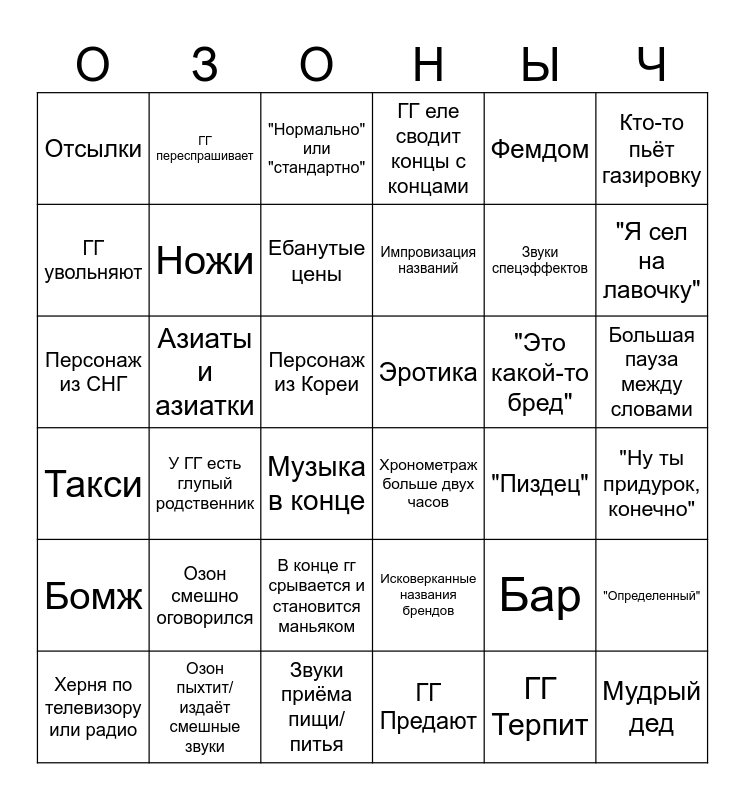 This bingo card has 36 words: Исковерканные названия брендов, В конце гг срывается и становится маньяком, ГГ Предают, ГГ увольняют, Такси, Эротика, Ножи, Звуки приёма пищи/питья, Фемдом, Бар, "Я сел на лавочку", ГГ еле сводит концы с концами, "Определенный", Азиаты и азиатки, Импровизация названий, Отсылки, Бомж, "Это какой-то бред", Персонаж из СНГ, "Нормально" или "стандартно", Персонаж из Кореи, У ГГ есть глупый родственник, Хронометраж больше двух часов, Музыка в конце, "Пиздец", ГГ переспрашивает, Звуки спецэффектов, Озон пыхтит/издаёт смешные звуки, Ебанутые цены, Кто-то пьёт газировку, Мудрый дед, Херня по телевизору или радио, "Ну ты придурок, конечно", Большая пауза между словами, Озон смешно оговорился and ГГ Терпит.