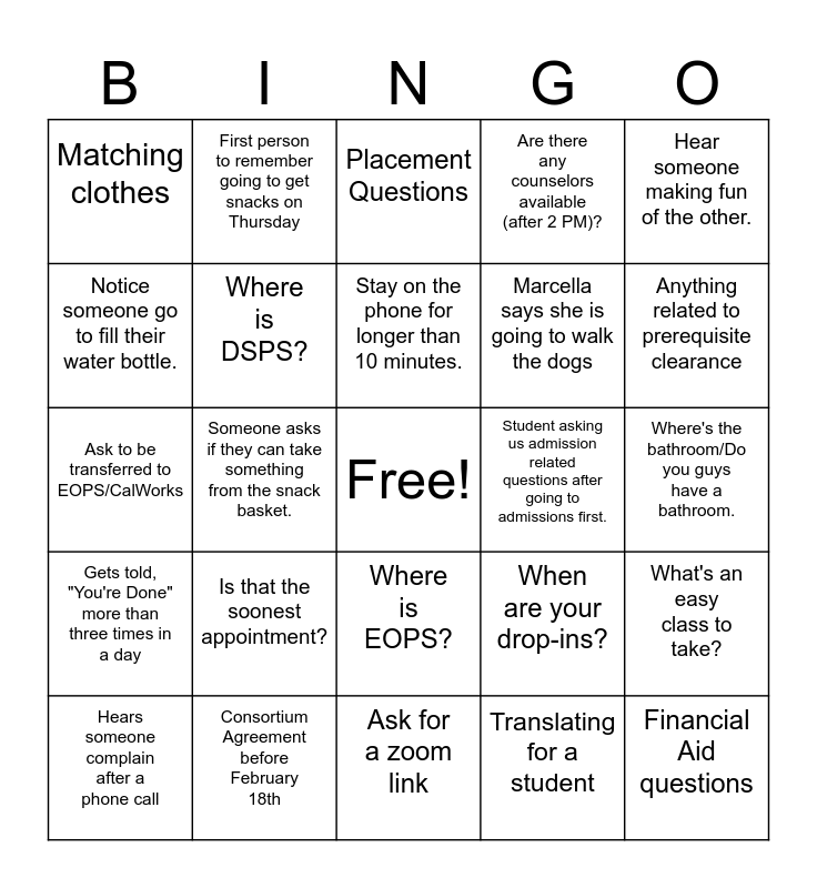 This bingo card has a free space and 24 words: Is that the soonest appointment?, Consortium Agreement before February 18th, Stay on the phone for longer than 10 minutes., Hears someone complain after a phone call, Hear someone making fun of the other., Matching clothes, Notice someone go to fill their water bottle., First person to remember going to get snacks on Thursday, Student asking us admission related questions after going to admissions first., Where is EOPS?, Marcella says she is going to walk the dogs, Ask to be transferred to EOPS/CalWorks, When are your drop-ins?, What's an easy class to take?, Where is DSPS?, Translating for a student, Where's the bathroom/Do you guys have a bathroom., Placement Questions, Anything related to prerequisite clearance, Someone asks if they can take something from the snack basket., Financial Aid questions, Gets told, "You're Done" more than three times in a day, Are there any counselors available (after 2 PM)? and Ask for a zoom link.