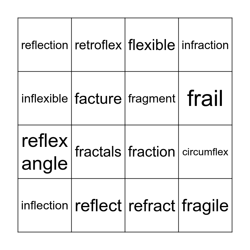 This bingo card has 20 words: circumflex, deflect, flexible, flexor, inflection, inflexible, reflect, reflection, reflex angle, retroflex, fractals, fraction, facture, fragile, fragment, fragmented, frail, infraction, refract and suffrage.