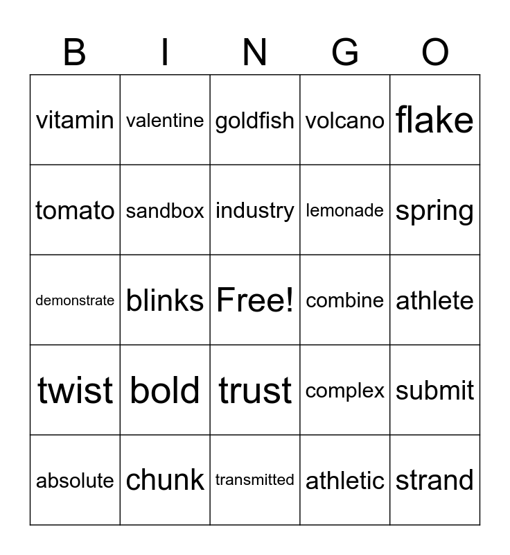 This bingo card has a free space and 24 words: bold, chunk, industry, absolute, flake, vitamin, tomato, valentine, combine, trust, lemonade, demonstrate, complex, submit, sandbox, athletic, athlete, goldfish, spring, blinks, strand, twist, volcano and transmitted.
