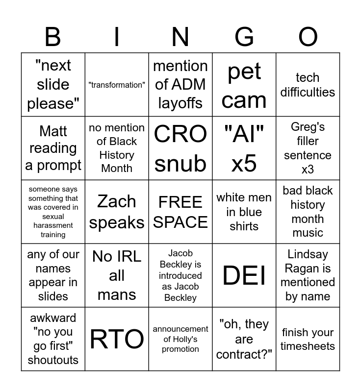 This bingo card has a free space and 24 words: No IRL all mans, RTO, CRO snub, awkward "no you go first" shoutouts, tech difficulties, "next slide please", Matt reading a prompt, "transformation", white men in blue shirts, Jacob Beckley is introduced as Jacob Beckley, "AI" x5, someone says something that was covered in sexual harassment training, DEI, Lindsay Ragan is mentioned by name, no mention of Black History Month, "oh, they are contract?", bad black history month music, mention of ADM layoffs, Greg's filler sentence x3, Zach speaks, finish your timesheets, any of our names appear in slides, pet cam and announcement of Holly's promotion.