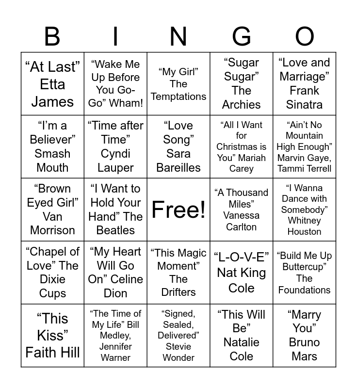 This bingo card has a free space and 29 words: “This Kiss” Faith Hill, “Crazy Little Thing Called Love” Queen, “I Want to Hold Your Hand” The Beatles, “Burning Love” Elvis Presley, “At Last” Etta James, “My Girl” The Temptations, “Time after Time” Cyndi Lauper, “My Heart Will Go On” Celine Dion, “A Thousand Miles” Vanessa Carlton, “The Time of My Life” Bill Medley, Jennifer Warner, “I Wanna Dance with Somebody” Whitney Houston, “Marry You” Bruno Mars, “Signed, Sealed, Delivered” Stevie Wonder, “This Will Be” Natalie Cole, “Ain’t No Mountain High Enough” Marvin Gaye, Tammi Terrell, “More Than a Feeling” Boston, “This Magic Moment” The Drifters, “Chapel of Love” The Dixie Cups, “Love and Marriage” Frank Sinatra, “Brown Eyed Girl” Van Morrison, “L-O-V-E” Nat King Cole, “Summer Nights” Grease, “All I Want for Christmas is You” Mariah Carey, “I’m a Believer” Smash Mouth, “Sugar Sugar” The Archies, “Wake Me Up Before You Go-Go” Wham!, “Build Me Up Buttercup” The Foundations, “Love Song” Sara Bareilles and “Our Song” Taylor Swift.