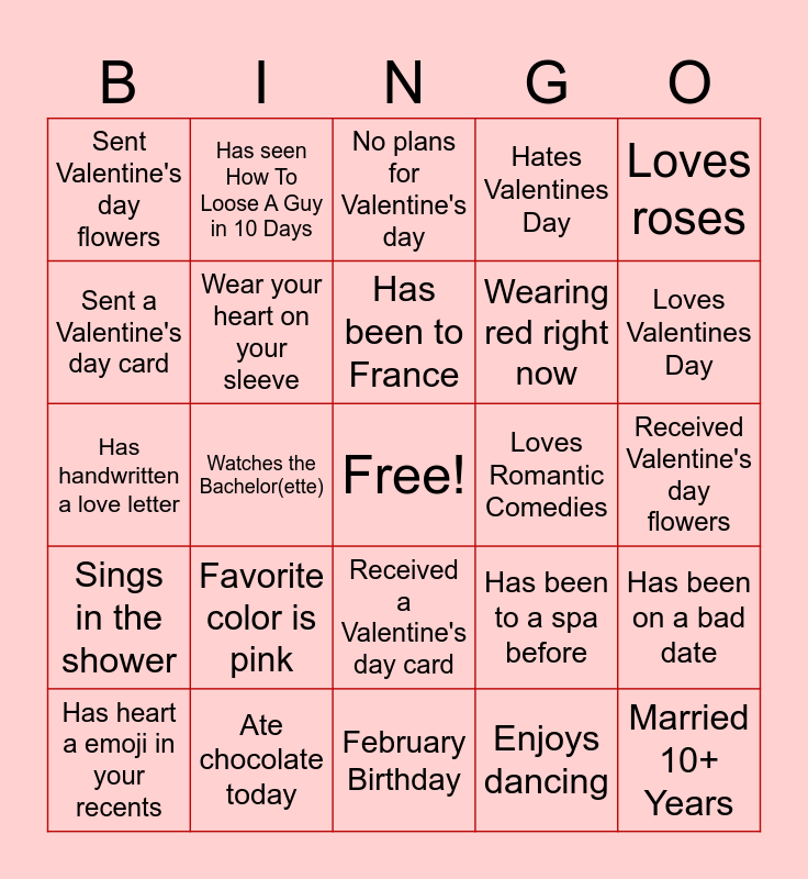 This bingo card has a free space and 24 words: Favorite color is pink, Ate chocolate today, Has been to France, Has heart a emoji in your recents, Loves roses, Sent Valentine's day flowers, Sent a Valentine's day card, Has seen How To Loose A Guy in 10 Days, Loves Romantic Comedies, Received a Valentine's day card, Wearing red right now, Has handwritten a love letter, Has been to a spa before, Has been on a bad date, Wear your heart on your sleeve, Enjoys dancing, Received Valentine's day flowers, No plans for Valentine's day, Loves Valentines Day, Watches the Bachelor(ette), Married 10+ Years, Sings in the shower, Hates Valentines Day and February Birthday.