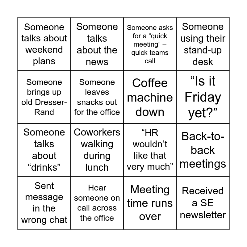 This bingo card has 30 words: Someone mentions weather, Someone brings up lunch early, Back-to-back meetings, Technical difficulties – computer issues, Someone talks about weekend plans, Someone asks for a “quick meeting” – quick teams call, Coffee machine down, Someone using the printer, Hear someone on call across the office, Spilled coffee, Meeting time runs over, Sent message in the wrong chat, Someone asks for your help, Someone is late to a meeting, Coworkers walking during lunch, Is that a Glenn cutout??, Someone wears funny/colorful socks, Received a SE newsletter, Someone mentions the Bills, Someone brings up old Dresser-Rand, “HR wouldn’t like that very much”, See Dennis walking around the office, Someone talks about the news, Someone talks about “drinks”, Someone leaves snacks out for the office, Someone using their stand-up desk, Someone using the concession are in cafeteria, In person conference room meeting, “Is it Friday yet?” and Someone brings up going home.