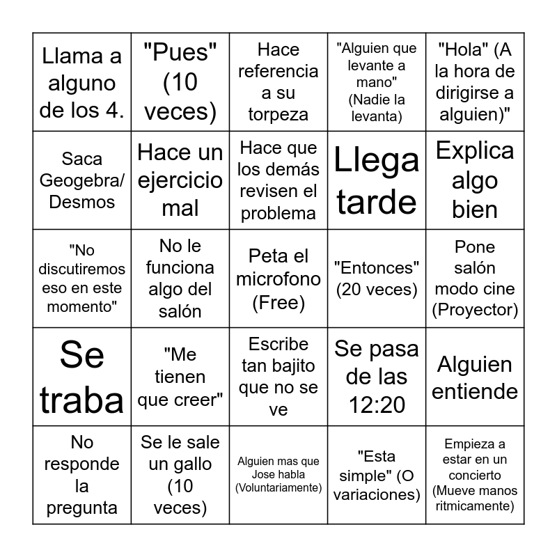 This bingo card has a free space and 33 words: "Puede que funcione o no" (o variaciones), "Cierto" (20 veces), No le funciona algo del salón, Dice el nombre de alguien mal, Se traba, Hace un ejercicio mal, "Hola" (A la hora de dirigirse a alguien)", No responde la pregunta, "Pues" (10 veces), Habla de su horario de atención, Hace que los demás revisen el problema, Hace referencia a su torpeza, "Si o no" (5 veces), "Se me acabó el tiempo" (o variaciones), "Entonces" (20 veces), Explica algo bien, Se le sale un gallo (10 veces), "No discutiremos eso en este momento", "Me tienen que creer", Se pasa de las 12:20, Escribe tan bajito que no se ve, "Ehhh" (20 veces), Llama a alguno de los 4., Pone salón modo cine (Proyector), Alguien mas que Jose habla (Voluntariamente), Empieza a estar en un concierto (Mueve manos ritmicamente), "Alguien que levante a mano" (Nadie la levanta), Llega tarde, Saca Geogebra/ Desmos, Alguien entiende, Da un "truco", "Esta simple" (O variaciones) and Se pone en modo poeta.