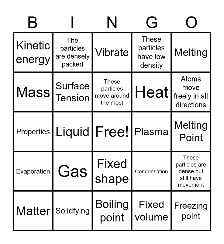 This bingo card has a free space and 29 words: Matter, Solid, Liquid, Density, Kinetic energy, Vibrate, Surface Tension, Gas, Plasma, Solidfying, Melting Point, Freezing point, Boiling point, Fixed volume, Atoms move freely in all directions, Boiling, Fixed shape, Evaporation, Melting, Properties, Condensation, Particles, Heat, Mass, These particles have low density, The particles are densely packed, These particles are dense but still have movement, These particles move around the most and This state has a fixed volume but not a fixed shape.