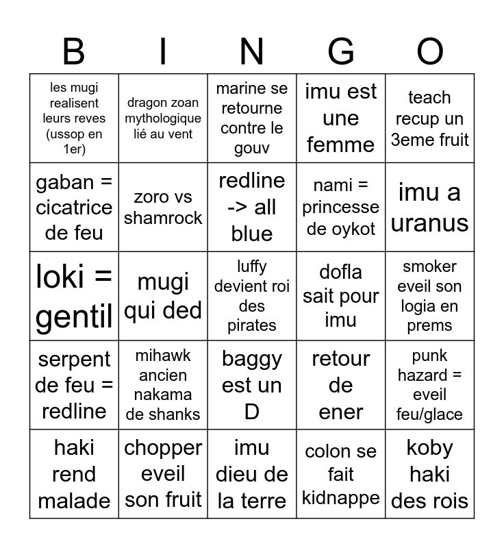 This bingo card has a free space and 24 words: mihawk ancien nakama de shanks, chopper eveil son fruit, redline -> all blue, haki rend malade, teach recup un 3eme fruit, les mugi realisent leurs reves (ussop en 1er), gaban = cicatrice de feu, dragon zoan mythologique lié au vent, dofla sait pour imu, baggy est un D, nami = princesse de oykot, loki = gentil, retour de ener, punk hazard = eveil feu/glace, zoro vs shamrock, colon se fait kidnappe, smoker eveil son logia en prems, marine se retourne contre le gouv, imu a uranus, mugi qui ded, koby haki des rois, serpent de feu = redline, imu est une femme and imu dieu de la terre.