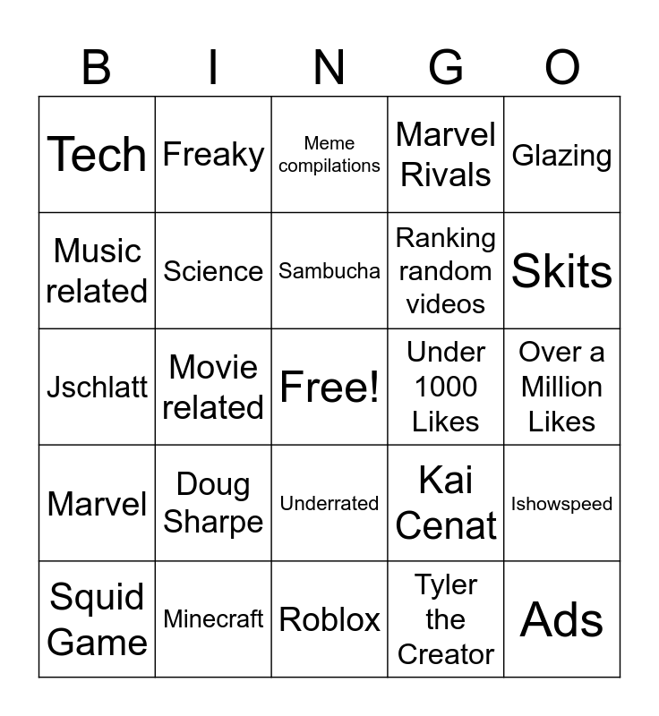 This bingo card has a free space and 24 words: Squid Game, Doug Sharpe, Sambucha, Tyler the Creator, Glazing, Tech, Freaky, Meme compilations, Under 1000 Likes, Over a Million Likes, Jschlatt, Science, Kai Cenat, Ishowspeed, Music related, Minecraft, Roblox, Marvel Rivals, Skits, Marvel, Movie related, Underrated, Ranking random videos and Ads.