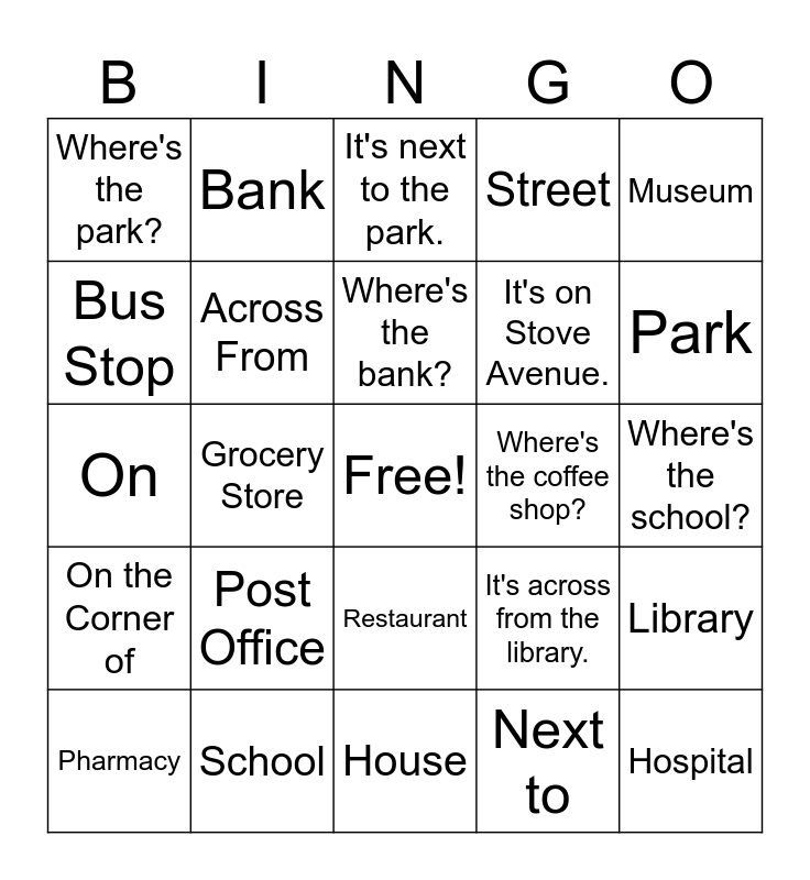 This bingo card has a free space and 24 words: Post Office, School, Where's the bank?, Pharmacy, Museum, Where's the park?, Bus Stop, Bank, Where's the coffee shop?, Restaurant, It's on Stove Avenue., On, It's across from the library., Library, Across From, Next to, Where's the school?, It's next to the park., Park, Grocery Store, Hospital, On the Corner of, Street and House.
