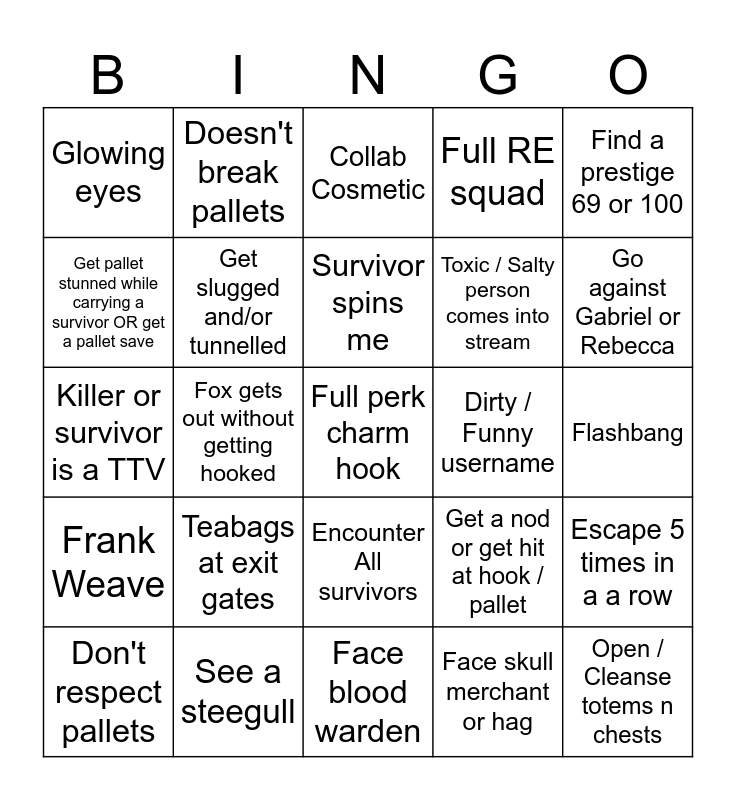 This bingo card has a free space and 34 words: Flashlight save, Face skull merchant or hag, Survivor running no mither, Survivor giving key, Frank Weave, Get slugged and/or tunnelled, Find a prestige 69 or 100, Don't respect pallets, Doesn't break pallets, Eyerie of crow offering, Survivor spins me, Collab Cosmetic, Adept survivor / Adept killer, Get grabbed or Grab someone, Dirty / Funny username, Go against Gabriel or Rebecca, See a steegull, Killer or survivor is a TTV, Teabags at exit gates, Get a nod or get hit at hook / pallet, Encounter All survivors, 4% unhook, Glowing eyes, Flashbang, Face blood warden, Open / Cleanse totems n chests, Full RE squad, NOED, Toxic / Salty person comes into stream, Get pallet stunned while carrying a survivor OR get a pallet save, Full p100 Team, Fox gets out without getting hooked, Escape 5 times in a a row and 4 man escape 3 games in a row.