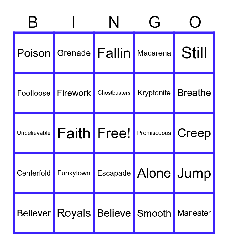 This bingo card has a free space and 25 words: Funkytown, Believe, Ghostbusters, Believer, Still, Poison, Footloose, Grenade, Promiscuous, Escapade, Kryptonite, Unbelievable, Alone, Jump, Firework, Waterfalls, Creep, Fallin, Breathe, Faith, Maneater, Royals, Centerfold, Macarena and Smooth.
