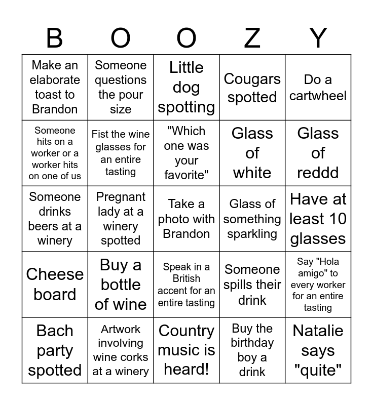 This bingo card has a free space and 24 words: Buy a bottle of wine, Artwork involving wine corks at a winery, "Which one was your favorite", Bach party spotted, Do a cartwheel, Make an elaborate toast to Brandon, Someone hits on a worker or a worker hits on one of us, Someone questions the pour size, Glass of something sparkling, Speak in a British accent for an entire tasting, Glass of white, Someone drinks beers at a winery, Someone spills their drink, Say "Hola amigo" to every worker for an entire tasting, Fist the wine glasses for an entire tasting, Buy the birthday boy a drink, Have at least 10 glasses, Little dog spotting, Glass of reddd, Pregnant lady at a winery spotted, Natalie says "quite", Cheese board, Cougars spotted and Country music is heard!.
