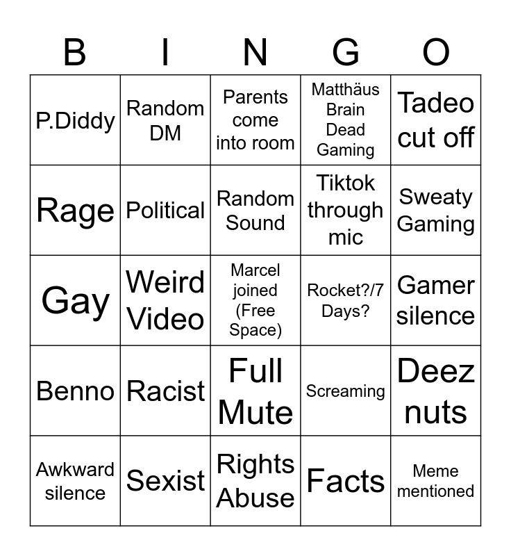 This bingo card has a free space and 24 words: Racist, Sexist, Random Sound, Awkward silence, Tadeo cut off, P.Diddy, Rage, Random DM, Rocket?/7 Days?, Full Mute, Tiktok through mic, Gay, Screaming, Deez nuts, Political, Facts, Gamer silence, Parents come into room, Sweaty Gaming, Weird Video, Meme mentioned, Benno, Matthäus Brain Dead Gaming and Rights Abuse.