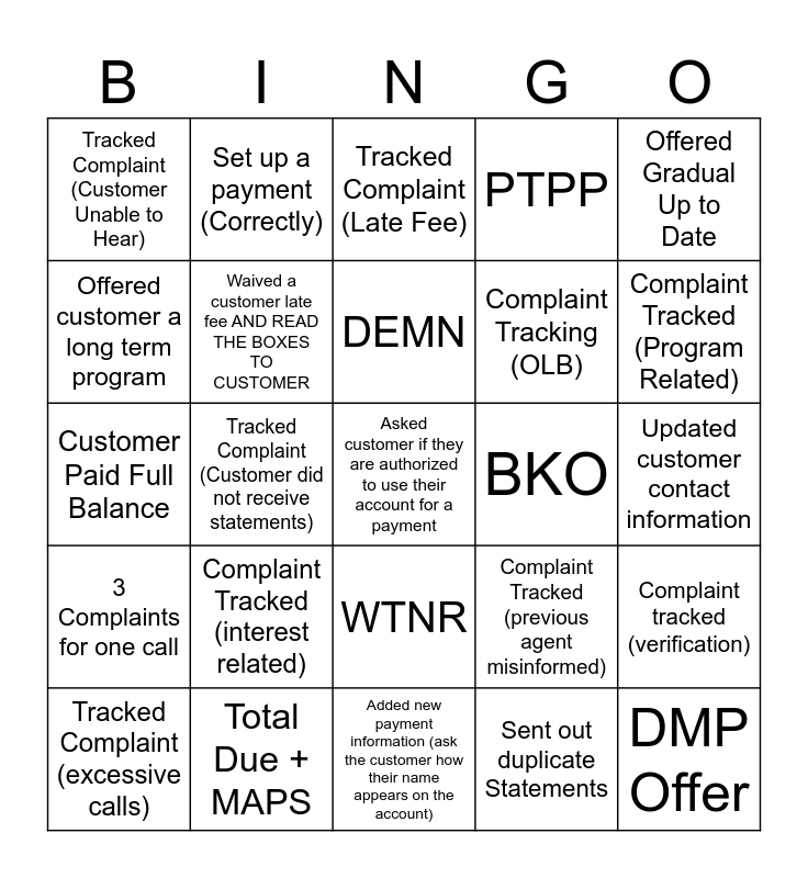 This bingo card has a free space and 24 words: Complaint Tracked (interest related), Total Due + MAPS, DEMN, Tracked Complaint (excessive calls), Offered Gradual Up to Date, Tracked Complaint (Customer Unable to Hear), Offered customer a long term program, Set up a payment (Correctly), BKO, WTNR, Complaint Tracking (OLB), Customer Paid Full Balance, Complaint Tracked (previous agent misinformed), Complaint tracked (verification), Waived a customer late fee AND READ THE BOXES TO CUSTOMER, Sent out duplicate Statements, Updated customer contact information, Tracked Complaint (Late Fee), Complaint Tracked (Program Related), Tracked Complaint (Customer did not receive statements), DMP Offer, 3 Complaints for one call, PTPP and Added new payment information (ask the customer how their name appears on the account).