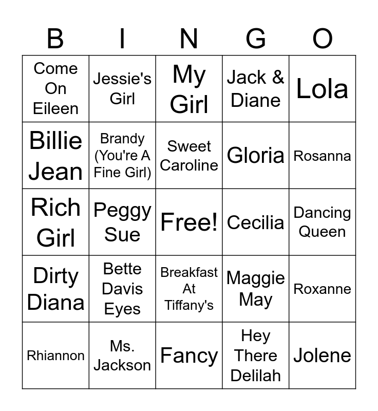 This bingo card has a free space and 49 words: My Maria, Jolene, Miami, My Amy, Fancy, Bette Davis Eyes, Stacy's Mom, Jessie's Girl, Just Like Jesse James, Billie Jean, Uptown Girl, Brandy (You're A Fine Girl), Jack & Diane, Roxanne, Maggie May, Layla, Mandy, Sweet Caroline, Cecilia, Lucy In the Sky with Diamonds, Lola, Peggy Sue, Hey There Delilah, Come On Eileen, Gloria, Proud Mary, Rosanna, Rhiannon, My Sharona, Breakfast At Tiffany's, Dirty Diana, Good Golly, Miss Molly, Sandy (From Grease), Black Betty, Mrs. Robinson, Ms. Jackson, Amanda, Barbie Girl, California Gurls, Dancing Queen, Girl On Fire, The Girl From Ipanema, Brown Eyed Girl, Fat Bottom Girls, Oh, Pretty Woman, Rich Girl, My Girl, Mississippi Girl, Super Freak and Crazy Girl.