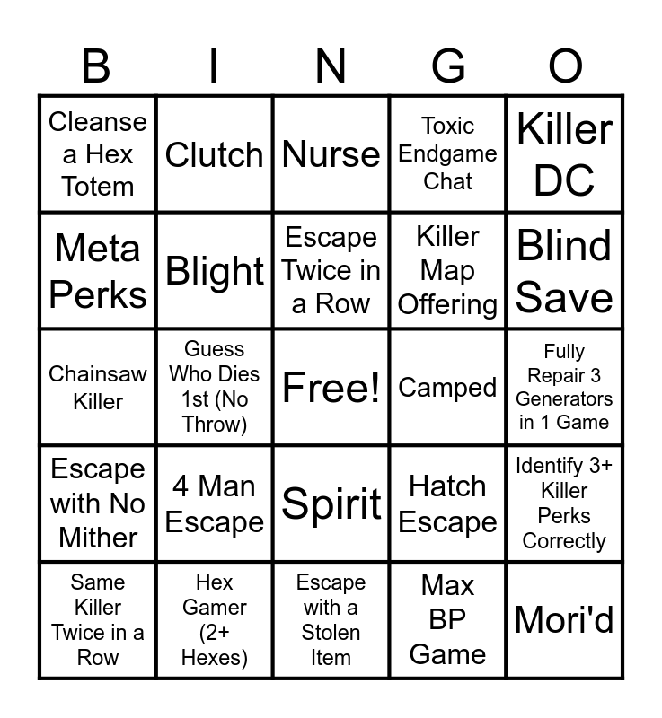 This bingo card has a free space and 30 words: Hex Gamer (2+ Hexes), Tunneled :(, Guess Who Dies 1st (No Throw), Sandbag into a Down, Cleanse a Hex Totem, Nurse, Blight, Spirit, Camped, Escape with a Stolen Item, Fully Repair 3 Generators in 1 Game, Mori'd, Max BP Game, Escape Last Alive, Blind Save, Pallet Save, Hatch Escape, Escape with No Mither, 4 Man Escape, Killer DC, Chainsaw Killer, Escape with no Hooks, Clutch, Killer Map Offering, Meta Perks, Toxic Endgame Chat, Identify 3+ Killer Perks Correctly, Same Killer Twice in a Row, Escape Twice in a Row and Allowed to Leave.
