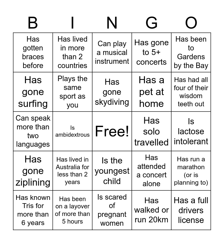 This bingo card has a free space and 24 words: Has lived in Australia for less than 2 years, Has been on a layover of more than 5 hours, Has gone skydiving, Has known Tris for more than 6 years, Has been to Gardens by the Bay, Has gotten braces before, Has gone surfing, Has lived in more than 2 countries, Has solo travelled, Is the youngest child, Has a pet at home, Can speak more than two languages, Has attended a concert alone, Has run a marathon (or is planning to), Plays the same sport as you, Has walked or run 20km, Is lactose intolerant, Can play a musical instrument, Has had all four of their wisdom teeth out, Is ambidextrous, Has a full drivers license, Has gone ziplining, Has gone to 5+ concerts and Is scared of pregnant women.