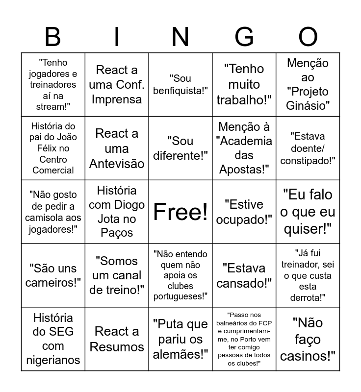 This bingo card has a free space and 24 words: História do SEG com nigerianos, "Somos um canal de treino!", "Sou diferente!", "Passo nos balneários do FCP e cumprimentam-me, no Porto vem ter comigo pessoas de todos os clubes!", Menção ao "Projeto Ginásio", "Tenho jogadores e treinadores aí na stream!", React a uma Conf. Imprensa, "Sou benfiquista!", "Estive ocupado!", "Eu falo o que eu quiser!", "Não gosto de pedir a camisola aos jogadores!", React a uma Antevisão, "Estava cansado!", "Já fui treinador, sei o que custa esta derrota!", História do pai do João Félix no Centro Comercial, React a Resumos, "Puta que pariu os alemães!", "Tenho muito trabalho!", "Estava doente/ constipado!", "São uns carneiros!", História com Diogo Jota no Paços, "Não entendo quem não apoia os clubes portugueses!", Menção à "Academia das Apostas!" and "Não faço casinos!".