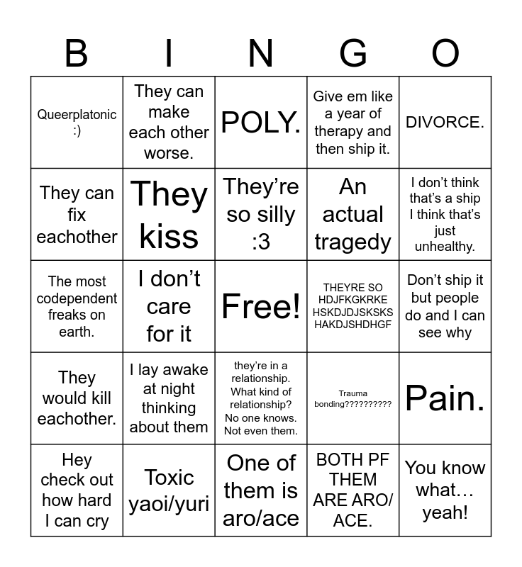 This bingo card has a free space and 24 words: I lay awake at night thinking about them, Toxic yaoi/yuri, They’re so silly :3, Hey check out how hard I can cry, DIVORCE., Queerplatonic :), They can fix eachother, They can make each other worse., THEYRE SO HDJFKGKRKE HSKDJDJSKSKS HAKDJSHDHGF, they’re in a relationship. What kind of relationship? No one knows. Not even them., An actual tragedy, The most codependent freaks on earth., Trauma bonding??????????, Pain., They kiss, BOTH PF THEM ARE ARO/ ACE., Don’t ship it but people do and I can see why, POLY., I don’t think that’s a ship I think that’s just unhealthy., I don’t care for it, You know what…yeah!, They would kill eachother., Give em like a year of therapy and then ship it. and One of them is aro/ace.