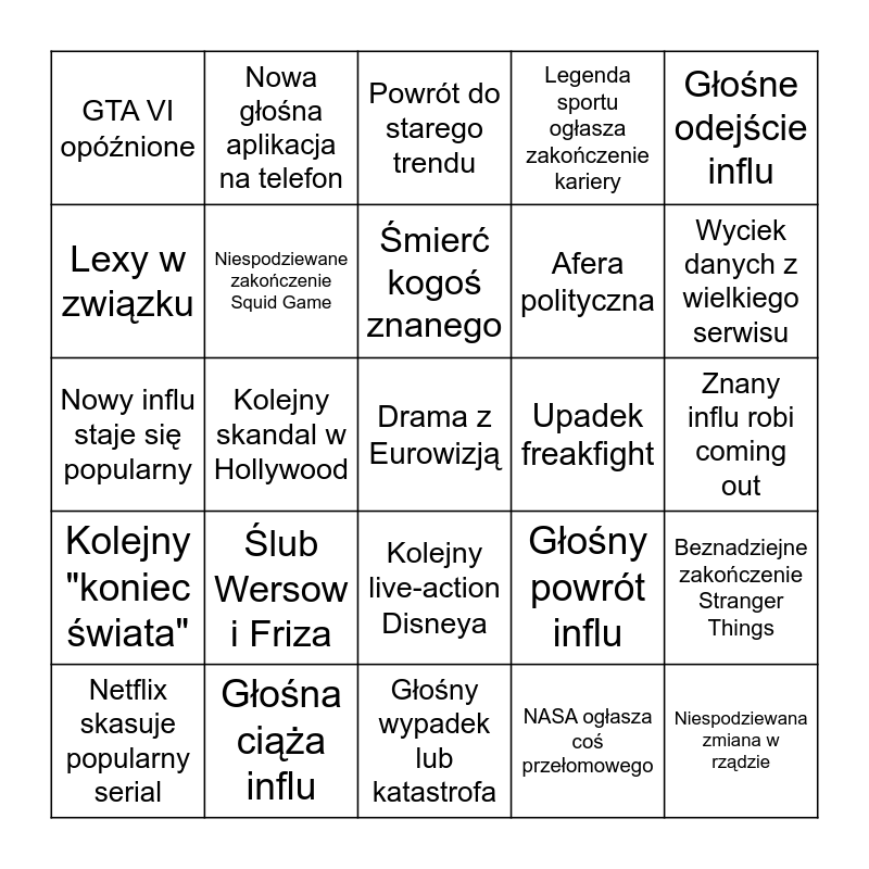 This bingo card has a free space and 24 words: Ślub Wersow i Friza, Głośna ciąża influ, Śmierć kogoś znanego, Netflix skasuje popularny serial, Głośne odejście influ, GTA VI opóźnione, Lexy w związku, Nowa głośna aplikacja na telefon, Upadek freakfight, Kolejny live-action Disneya, Afera polityczna, Nowy influ staje się popularny, Głośny powrót influ, Beznadziejne zakończenie Stranger Things, Niespodziewane zakończenie Squid Game, NASA ogłasza coś przełomowego, Znany influ robi coming out, Powrót do starego trendu, Wyciek danych z wielkiego serwisu, Kolejny skandal w Hollywood, Niespodziewana zmiana w rządzie, Kolejny "koniec świata", Legenda sportu ogłasza zakończenie kariery and Głośny wypadek lub katastrofa.