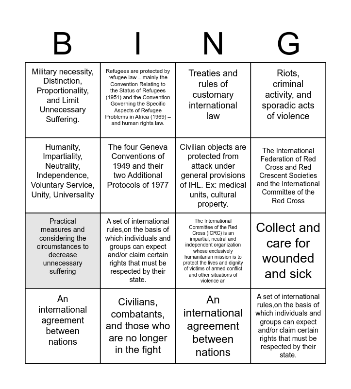 This bingo card has 21 words: Civilians, combatants, and those who are no longer in the fight, Humanity, Impartiality, Neutrality, Independence, Voluntary Service, Unity, Universality, Refugees are protected by refugee law – mainly the Convention Relating to the Status of Refugees (1951) and the Convention Governing the Specific Aspects of Refugee Problems in Africa (1969) – and human rights law., Situations of armed conflict, An international agreement between nations, Civilian objects are protected from attack under general provisions of IHL. Ex: medical units, cultural property., Military necessity, Distinction, Proportionality, and Limit Unnecessary Suffering., Treaties and rules of customary international law, The International Committee of the Red Cross (ICRC) is an impartial, neutral and independent organization whose exclusively humanitarian mission is to protect the lives and dignity of victims of armed conflict and other situations of violence an, The International Federation of Red Cross and Red Crescent Societies and the International Committee of the Red Cross, Practical measures and considering the circumstances to decrease unnecessary suffering, Riots, criminal activity, and sporadic acts of violence, A set of international rules,on the basis of which individuals and groups can expect and/or claim certain rights that must be respected by their state., Distribution of Relief Consignments, The four Geneva Conventions of 1949 and their two Additional Protocols of 1977, Collect and care for wounded and sick, An international agreement between nations, A set of international rules,on the basis of which individuals and groups can expect and/or claim certain rights that must be respected by their state., Humanity, Impartiality, Neutrality, Independence, Voluntary Service, Unity, Universality, Collect and care for wounded and sick and situations of armed conflict.