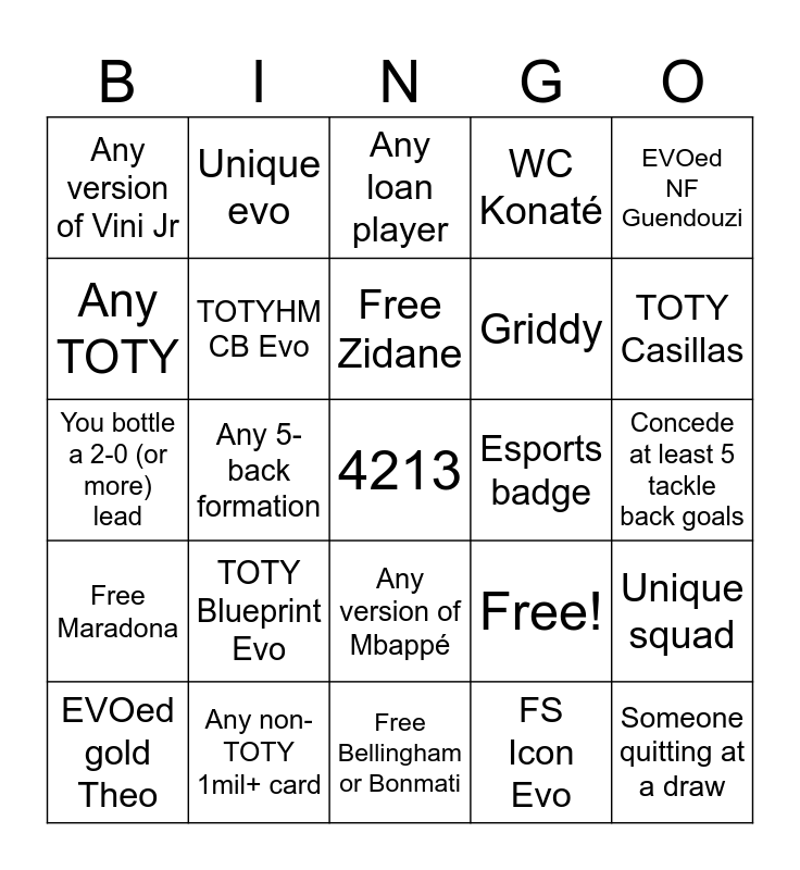 This bingo card has 25 words: TOTY Blueprint Evo, Free Bellingham or Bonmati, Free Zidane, EVOed gold Theo, EVOed NF Guendouzi, Any version of Vini Jr, Any TOTY, Unique evo, Esports badge, Any version of Mbappé, Griddy, You bottle a 2-0 (or more) lead, Free!, Unique squad, TOTYHM CB Evo, Someone quitting at a draw, Concede at least 5 tackle back goals, Any loan player, TOTY Casillas, Any 5-back formation, 4213, Any non-TOTY 1mil+ card, Free Maradona, WC Konaté and FS Icon Evo.