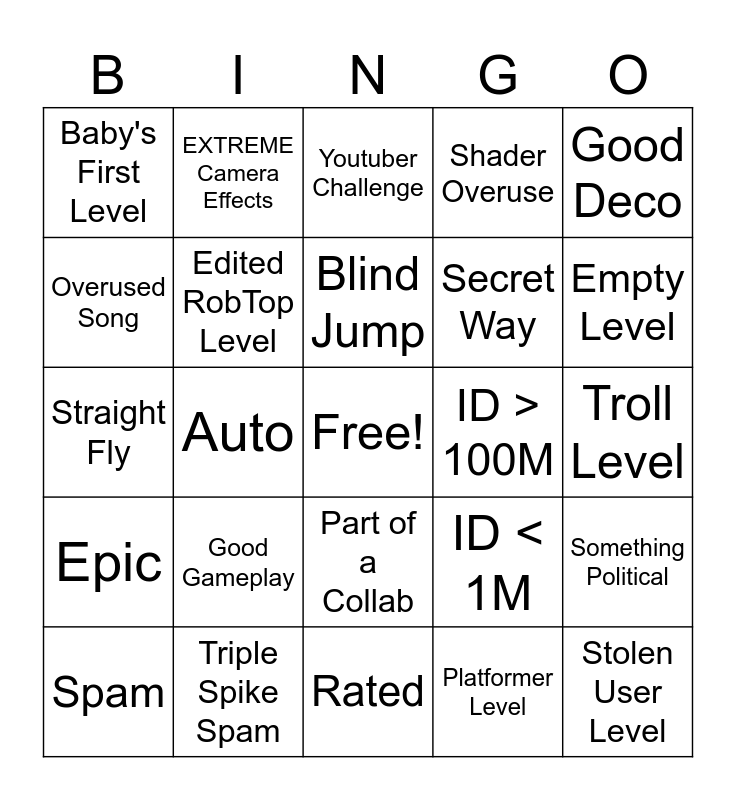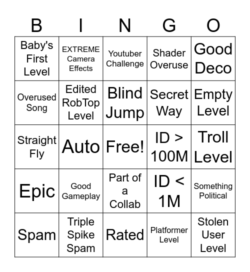 This bingo card has a free space and 29 words: Spam, Portal/Orb Spam, Auto, Featured, Baby's First Level, Youtuber Challenge, Edited RobTop Level, Good Gameplay, ID > 100M, Triple Spike Spam, Troll Level, Stolen User Level, Rated, Platformer Level, Empty Level, IMPOSSIBLE, Part of a Collab, Epic, Good Deco, Straight Fly, ID < 1M, Lobotomy, Secret Way, Overused Song, Shader Overuse, EXTREME Camera Effects, Something Political, Blind Jump and >80K Objects.