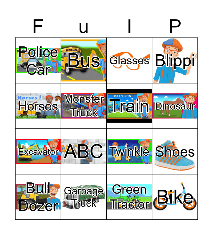 This bingo card has 18 images and 18 words: ABC, Bike, Glasses, Police Car, Twinkle, Blippi, Bull Dozer, Bus, Dinosaur, Excavator, Green Tractor, Horses, Shoes, Monster Truck, Train, Fire Truck, Garbage Truck and Construction Truck.