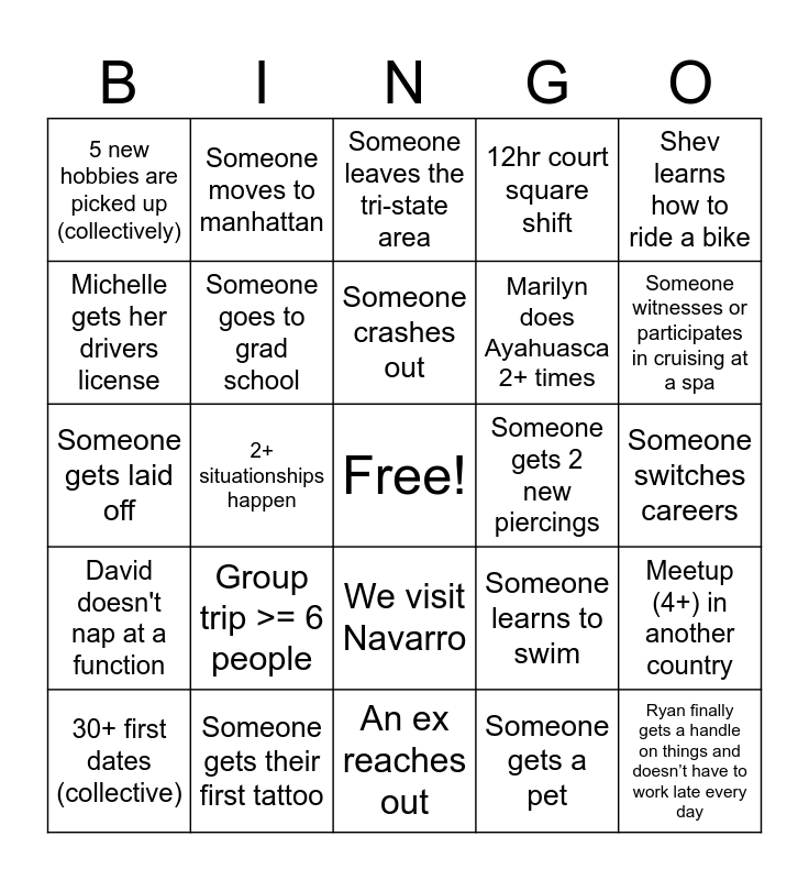 This bingo card has a free space and 24 words: Group trip >= 6 people, Someone gets their first tattoo, Someone crashes out, 30+ first dates (collective), Shev learns how to ride a bike, 5 new hobbies are picked up (collectively), Michelle gets her drivers license, Someone moves to manhattan, Someone gets 2 new piercings, We visit Navarro, Marilyn does Ayahuasca 2+ times, Someone gets laid off, Someone learns to swim, Meetup (4+) in another country, Someone goes to grad school, Someone gets a pet, Someone switches careers, Someone leaves the tri-state area, Someone witnesses or participates in cruising at a spa, 2+ situationships happen, Ryan finally gets a handle on things and doesn’t have to work late every day, David doesn't nap at a function, 12hr court square shift and An ex reaches out.
