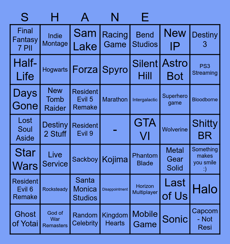 This bingo card has a free space and 48 words: Horizon Multiplayer, Astro Bot, Kingdom Hearts, Destiny 2 Stuff, Resident Evil 5 Remake, Shitty BR, Indie Montage, God of War Remasters, New IP, Kojima, Destiny 3, Racing Game, Superhero game, Intergalactic, Resident Evil 6 Remake, Wolverine, Half-Life, PS3 Streaming, Last of Us, Bend Studios, Silent Hill, Resident Evil 9, Final Fantasy 7 PII, Hogwarts, Halo, Forza, Bloodborne, Ghost of Yotai, Marathon, New Tomb Raider, Sonic, GTA VI, Something makes you smile :), Rocksteady, Lost Soul Aside, Phantom Blade, Metal Gear Solid, Days Gone, Sackboy, Santa Monica Studios, Star Wars, Capcom - Not Resi, Sam Lake, Random Celebrity, Spyro, Disappointment, Live Service and Mobile Game.