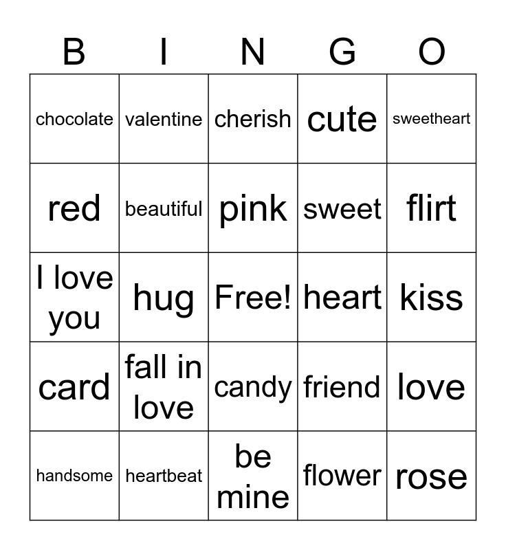 This bingo card has a free space and 24 words: fall in love, heartbeat, pink, handsome, sweetheart, chocolate, red, valentine, heart, candy, sweet, I love you, friend, love, beautiful, flower, kiss, cherish, flirt, hug, rose, card, cute and be mine.