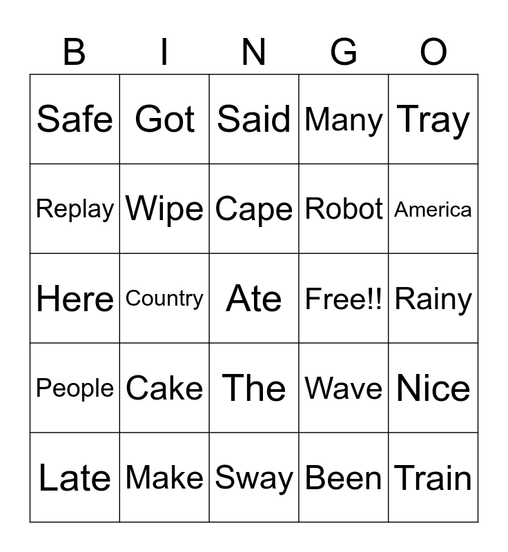 This bingo card has a free space and 24 words: Cake, Make, Cape, Late, Tray, Safe, Replay, Got, Free!!, The, Robot, Here, Wave, Nice, Wipe, Been, Rainy, Said, America, Country, Train, People, Many and Sway.