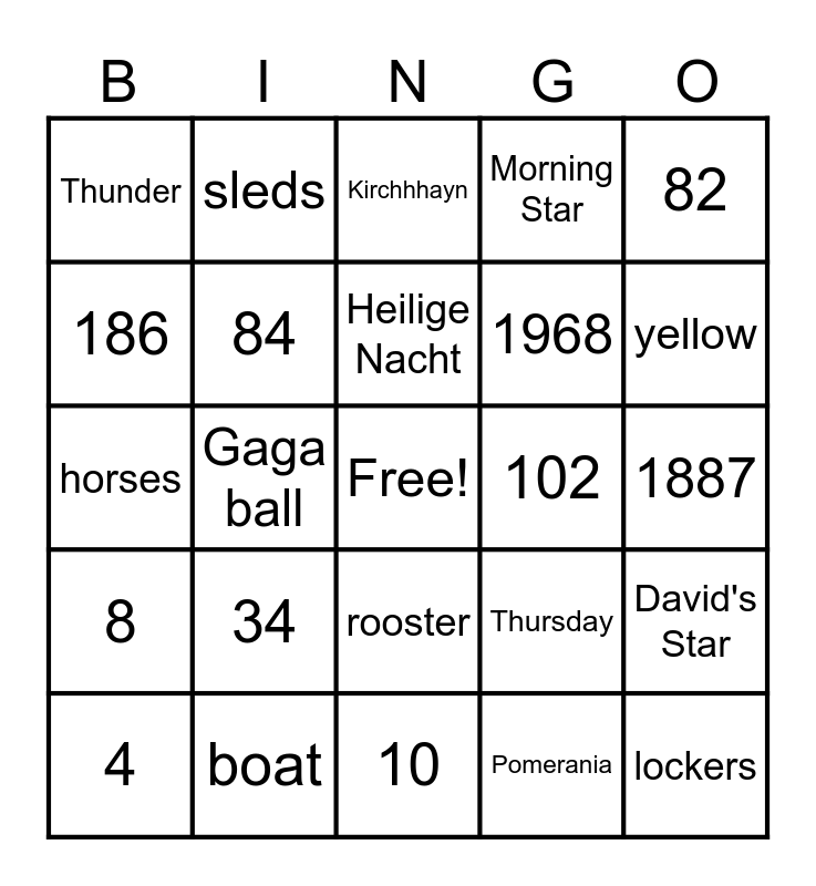This bingo card has a free space and 24 words: 34, boat, Heilige Nacht, 4, 82, Thunder, 186, sleds, 102, rooster, 1968, horses, Thursday, David's Star, 84, Pomerania, 1887, Kirchhhayn, yellow, Gaga ball, lockers, 8, Morning Star and 10.