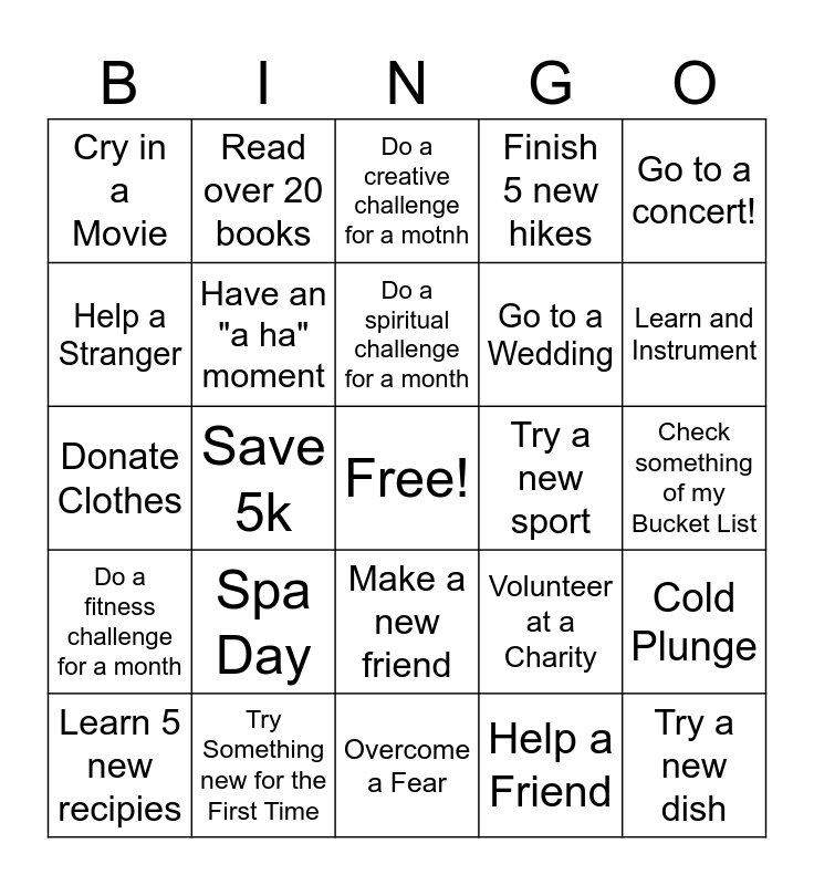 This bingo card has a free space and 24 words: Spa Day, Try Something new for the First Time, Do a spiritual challenge for a month, Learn 5 new recipies, Go to a concert!, Cry in a Movie, Help a Stranger, Read over 20 books, Try a new sport, Make a new friend, Go to a Wedding, Donate Clothes, Volunteer at a Charity, Cold Plunge, Have an "a ha" moment, Help a Friend, Check something of my Bucket List, Do a creative challenge for a motnh, Learn and Instrument, Save 5k, Try a new dish, Do a fitness challenge for a month, Finish 5 new hikes and Overcome a Fear.