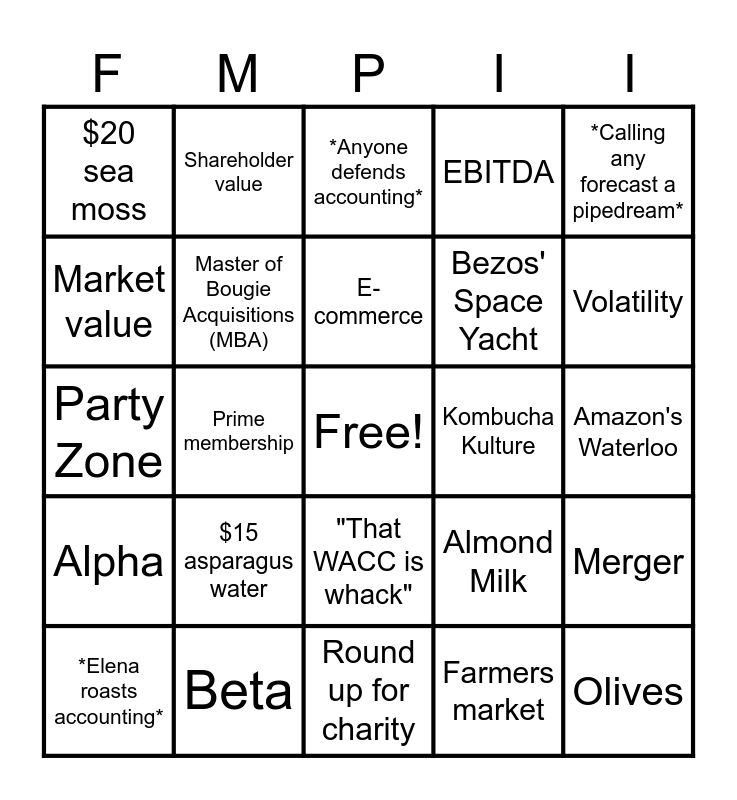 This bingo card has a free space and 121 words: Whole Paycheck, Dumb Millenials, Organic Chocolate Almonds, Hot Bar, Valuation, Premium, EBITDA, Enterprise value, Merger, Acquisition, Synergy, Mumbo Jumbo, Multiples, Target firm, Acquiring firm, Jeff Bezos, "That WACC is whack", *Elena fires someone*, *Elena tells someone to turn their camera on*, Managerial Decision, *Elena roasts accounting*, *Anyone defends accounting*, Free cash flow (FCF), Net present value (NPV), Net partner value, Alpha, Beta, Grindset, GMO labeling, Health-conscious, Farmers market, Prime membership, E-commerce, Fulfillment center, *Any comment on Bezos' biceps*, *Tom and Mike show up on camera together*, *Any Charlie and The Chocolate Factory reference*, Subscription model, Pricing power, *Any comment with "Hey Alexa" in it*, Kale Kingdom, Quinoa Capital, Organic Overlords, GMO-Free or GTFO, Tariffs on Avocados, Lululemon/sq foot, Grass-Fed everything, Kombucha Kulture, Essential Oils, Himalayan Salt, Crystal charging station, Soy Milk, Almond Milk, Bezos Bucks, *Referring to Alexa as spy technology*, Warehouse Wonderland, Doom scroll, Financial distress, Anti-trust regulation, Shareholder value, Stakeholder value, Return on investment, Sensitivity analysis, Return on Instacart (ROI), Return on Impulse (ROI), Market value, Perpetuity, Dear Shareholders, Trust Busting, Anti-trust, Party Zone, Cautiously optimistic, How big?, Size matters, *Any mention of pegging*, Bezos' Space Yacht, WACC-a-mole, Who's financing this?, Pizza, Olives, $15 asparagus water, $20 sea moss, Billionaire Biceps Index (BBI), *Any reference to being rejected by Whole Foods during recruiting*, Organic Oreos, The Great Oat Milk Shortage of 2026, Lululemon Index, Gluten-free, Amazon's Waterloo, Unprecedented, Sustainable capitalism, Monopoly, Round up for charity, Pump and dump, Buy the dip, *Any reference to the exam*, *Any reference to the snow day*, *Any reference to how weak Americans/Charlottesville residents are with snow*, *Calling any forecast a pipedream*, *Evan asks to call in the consultants at any point*, Big Grocery, Return on Avocados (ROA), Return on Espresso (ROE), Trader Joe's vs. Whole Foods, Master of Bougie Acquisitions (MBA), Is this ethical or just expensive?, Yoga Mom Mecca, *Max reminds Elena what his name is*, *Nate asks someone how they got that number*, *Davis shotguns a Celsius on camera*, Dividend, Capital structure, Asset turnover, Inventory turnover, Net Working Capital, Volatility, Board of directors, Investment Bankers, I'm more of a Dollar General person, myself, Vertical integration and Comps.