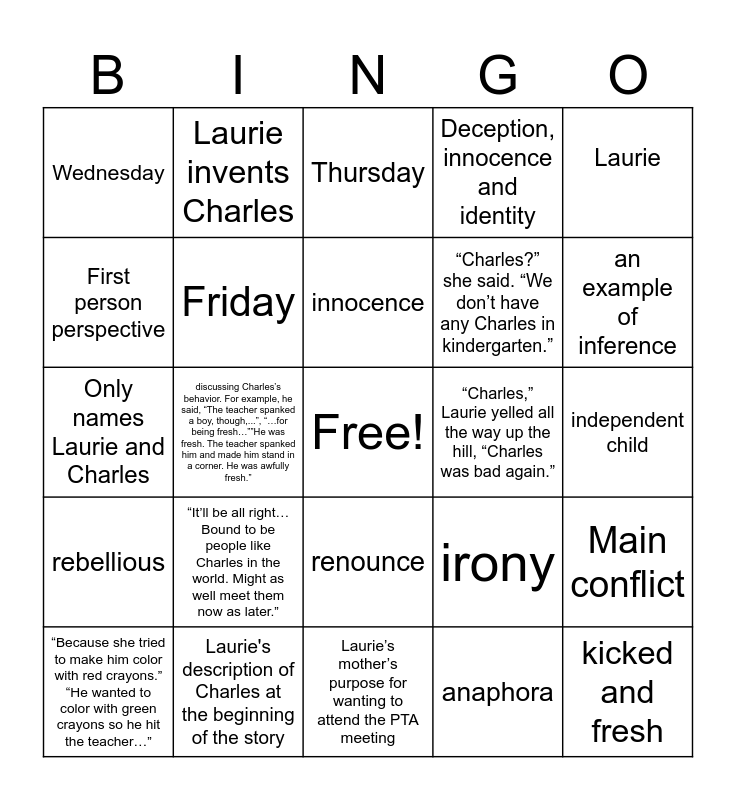 This bingo card has a free space and 29 words: “Because she tried to make him color with red crayons.” “He wanted to color with green crayons so he hit the teacher…”, “…he renounced corduroy overalls…,” he was a “long-trousered, swaggering character who forgot to stop at the corner and wave goodbye…,”, discussing Charles’s behavior. For example, he said, “The teacher spanked a boy, though,...”, “…for being fresh…””He was fresh. The teacher spanked him and made him stand in a corner. He was awfully fresh.”, Laurie “grinned enormously and said, ‘Today Charles hit the teacher.’”, Wednesday, Thursday, Friday, “It’ll be all right…Bound to be people like Charles in the world. Might as well meet them now as later.”, “Charles,” Laurie yelled all the way up the hill, “Charles was bad again.”, Laurie's description of Charles at the beginning of the story, independent child, kicked and fresh, Laurie’s mother’s purpose for wanting to attend the PTA meeting, anaphora, an example of inference, foreshadowing, renounce, rebellious, Laurie, Only names Laurie and Charles, irony, by keeping the setting outside of the school, “Charles?” she said. “We don’t have any Charles in kindergarten.”, First person perspective, Deception, innocence and identity, Laurie invents Charles, Main conflict, innocence and Oblivious.