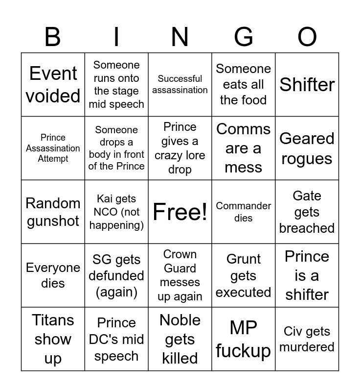 This bingo card has a free space and 24 words: SG gets defunded (again), Prince DC's mid speech, Prince gives a crazy lore drop, Titans show up, Shifter, Event voided, Prince Assassination Attempt, Someone runs onto the stage mid speech, Commander dies, Crown Guard messes up again, Comms are a mess, Random gunshot, Grunt gets executed, Prince is a shifter, Someone drops a body in front of the Prince, MP fuckup, Gate gets breached, Successful assassination, Geared rogues, Kai gets NCO (not happening), Civ gets murdered, Everyone dies, Someone eats all the food and Noble gets killed.
