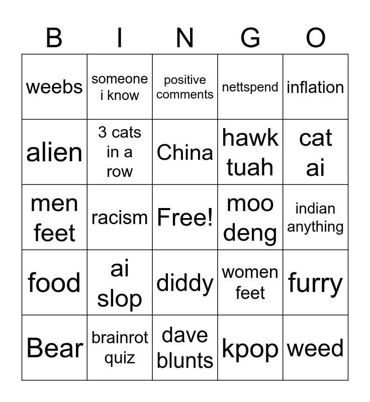 This bingo card has a free space and 24 words: ai slop, brainrot quiz, China, Bear, inflation, weebs, alien, someone i know, moo deng, diddy, hawk tuah, men feet, women feet, furry, 3 cats in a row, kpop, indian anything, positive comments, cat ai, racism, weed, food, nettspend and dave blunts.