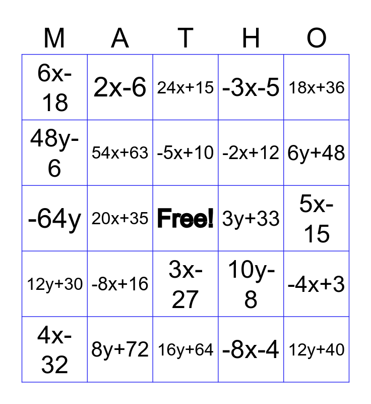 This bingo card has a free space and 29 words: 4x-32, 11y+33, 20x+35, -9x, 6x-18, 24x+15, 54x+63, -8x+16, 3y+33, 8y+72, 5x-15, 12y+40, 16y+64, -8x-4, 6y+48, 36y+30, 3x-27, 12y+30, 18x+36, -64y, 10y-8, 21y+56, -2x+12, 48y-6, -3x-5, 2x-6, -4x+3, -5x+10 and 3x+5.
