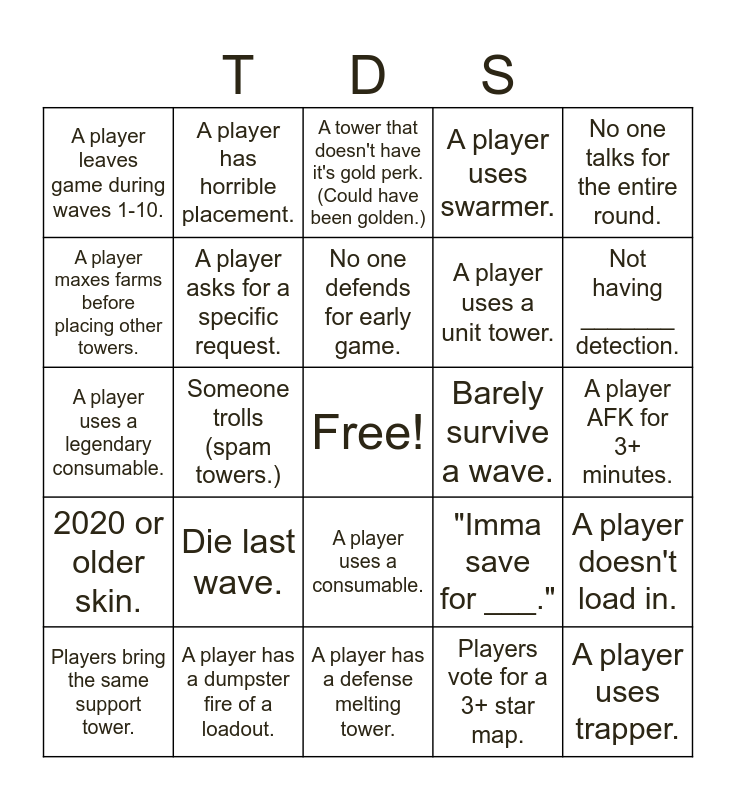 This bingo card has a free space and 24 words: Die last wave., A player has a dumpster fire of a loadout., No one defends for early game., Players bring the same support tower., No one talks for the entire round., A player leaves game during waves 1-10., A player maxes farms before placing other towers., A player has horrible placement., Barely survive a wave., A player uses a consumable., A player uses a unit tower., A player uses a legendary consumable., "Imma save for ___.", A player doesn't load in., A player asks for a specific request., Players vote for a 3+ star map., A player AFK for 3+ minutes., A tower that doesn't have it's gold perk. (Could have been golden.), Not having _______ detection., Someone trolls (spam towers.), A player uses trapper., 2020 or older skin., A player uses swarmer. and A player has a defense melting tower..