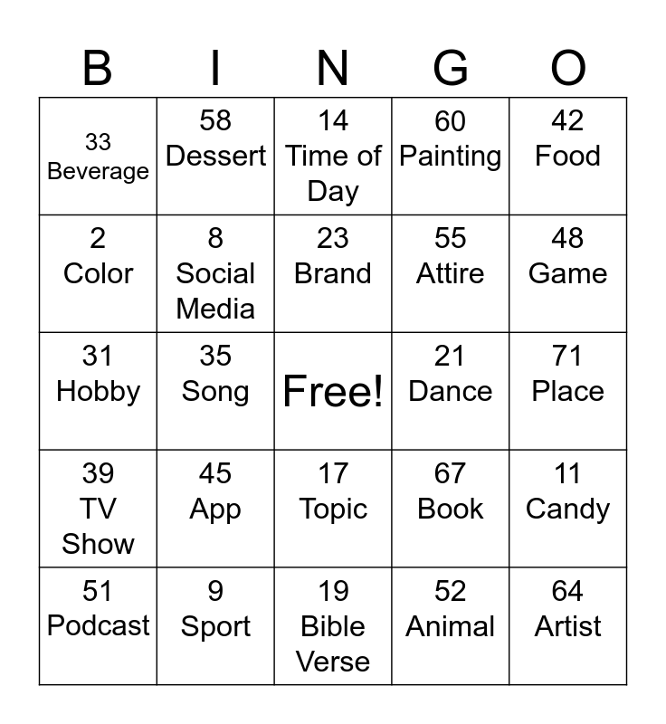 This bingo card has a free space and 24 words: 45 App, 9 Sport, 23 Brand, 51 Podcast, 42 Food, 33 Beverage, 2 Color, 58 Dessert, 21 Dance, 17 Topic, 55 Attire, 31 Hobby, 67 Book, 11 Candy, 8 Social Media, 52 Animal, 71 Place, 14 Time of Day, 48 Game, 35 Song, 64 Artist, 39 TV Show, 60 Painting and 19 Bible Verse.