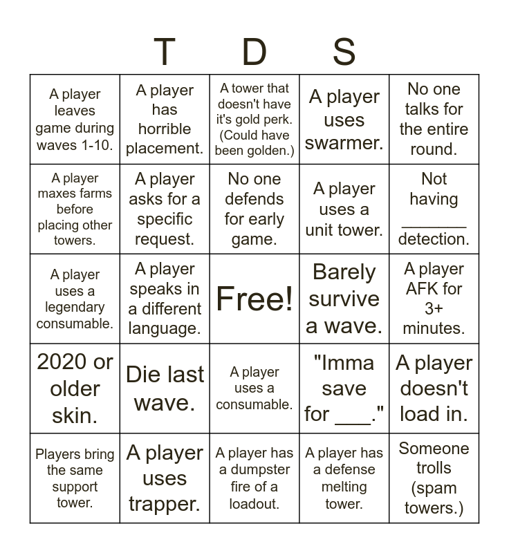 This bingo card has a free space and 25 words: Die last wave., A player has a dumpster fire of a loadout., No one defends for early game., Players bring the same support tower., No one talks for the entire round., A player leaves game during waves 1-10., A player maxes farms before placing other towers., A player has horrible placement., Barely survive a wave., A player uses a consumable., A player uses a unit tower., A player uses a legendary consumable., "Imma save for ___.", A player doesn't load in., A player asks for a specific request., Players vote for a 3+ star map., A player AFK for 3+ minutes., A tower that doesn't have it's gold perk. (Could have been golden.), Not having _______ detection., A player speaks in a different language., Someone trolls (spam towers.), A player uses trapper., 2020 or older skin., A player uses swarmer. and A player has a defense melting tower..