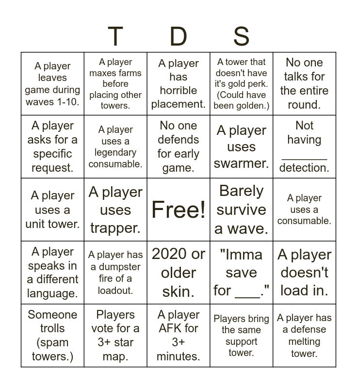 This bingo card has a free space and 25 words: Die last wave., A player has a dumpster fire of a loadout., No one defends for early game., Players bring the same support tower., No one talks for the entire round., A player leaves game during waves 1-10., A player maxes farms before placing other towers., A player has horrible placement., Barely survive a wave., A player uses a consumable., A player uses a unit tower., A player uses a legendary consumable., "Imma save for ___.", A player doesn't load in., A player asks for a specific request., Players vote for a 3+ star map., A player AFK for 3+ minutes., A tower that doesn't have it's gold perk. (Could have been golden.), Not having _______ detection., A player speaks in a different language., Someone trolls (spam towers.), A player uses trapper., 2020 or older skin., A player uses swarmer. and A player has a defense melting tower..