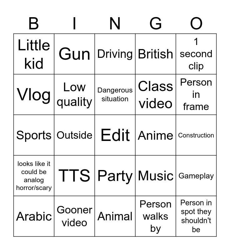 This bingo card has a free space and 24 words: TTS, Gooner video, Dangerous situation, Arabic, 1 second clip, Little kid, Vlog, Gun, Anime, Party, Class video, Sports, Music, Gameplay, Low quality, Person walks by, Construction, Driving, Person in frame, Outside, Person in spot they shouldn't be, looks like it could be analog horror/scary, British and Animal.