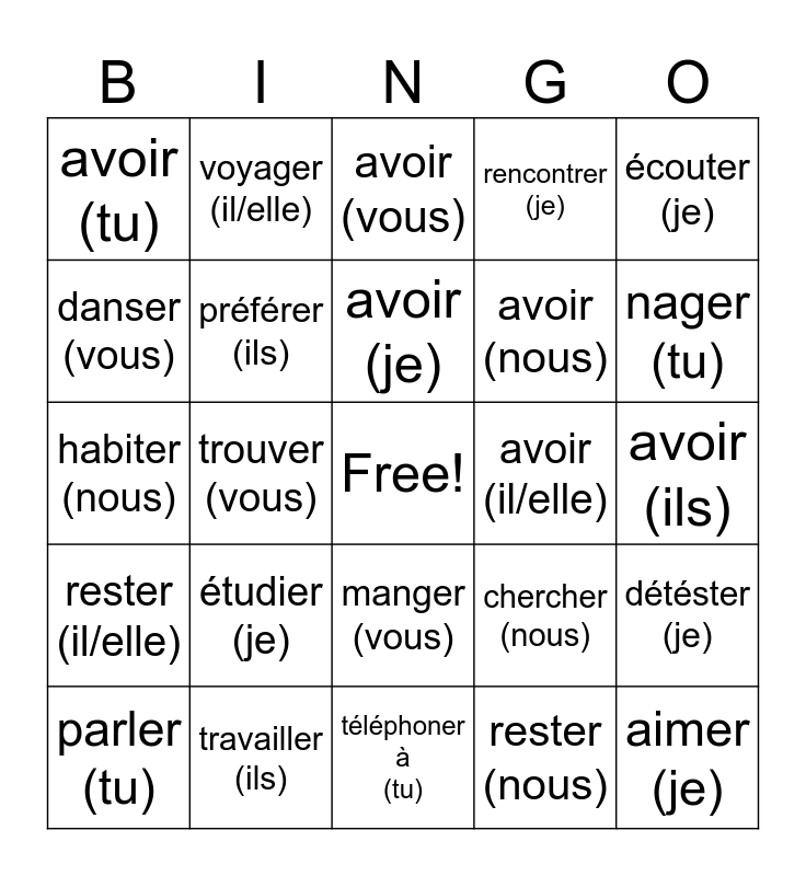 This bingo card has a free space and 24 words: étudier (je), travailler (ils), avoir (je), parler (tu), écouter (je), avoir (tu), danser (vous), voyager (il/elle), avoir (il/elle), manger (vous), avoir (nous), habiter (nous), chercher (nous), détéster (je), préférer (ils), rester (nous), avoir (ils), avoir (vous), nager (tu), trouver (vous), aimer (je), rester (il/elle), rencontrer (je) and téléphoner à (tu).