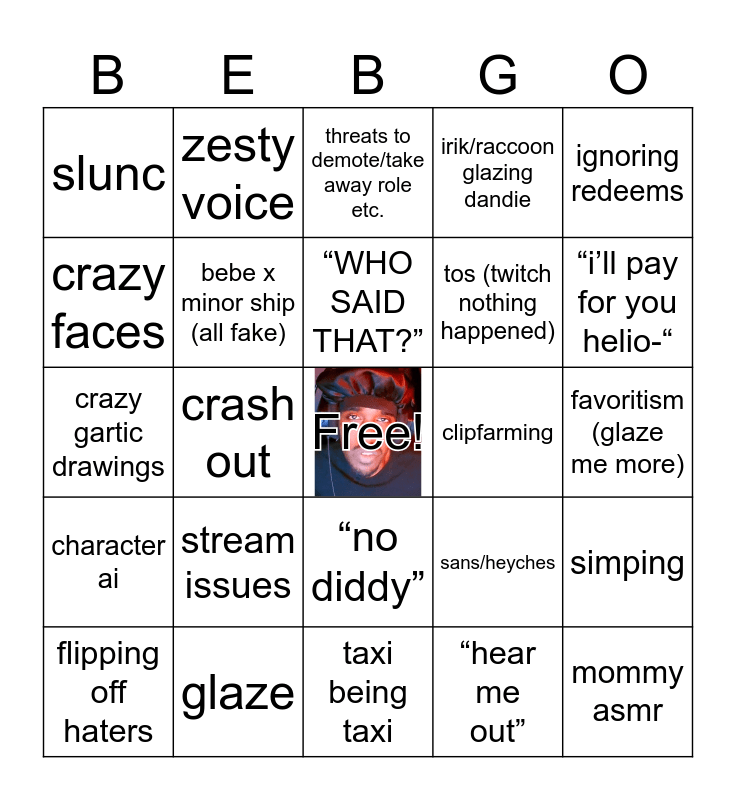 This bingo card has a free space and 24 words: stream issues, glaze, “WHO SAID THAT?”, flipping off haters, ignoring redeems, slunc, crazy faces, zesty voice, clipfarming, “no diddy”, tos (twitch nothing happened), crazy gartic drawings, sans/heyches, simping, bebe x minor ship (all fake), “hear me out”, favoritism (glaze me more), threats to demote/take away role etc., “i’ll pay for you helio-“, crash out, mommy asmr, character ai, irik/raccoon glazing dandie and taxi being taxi.