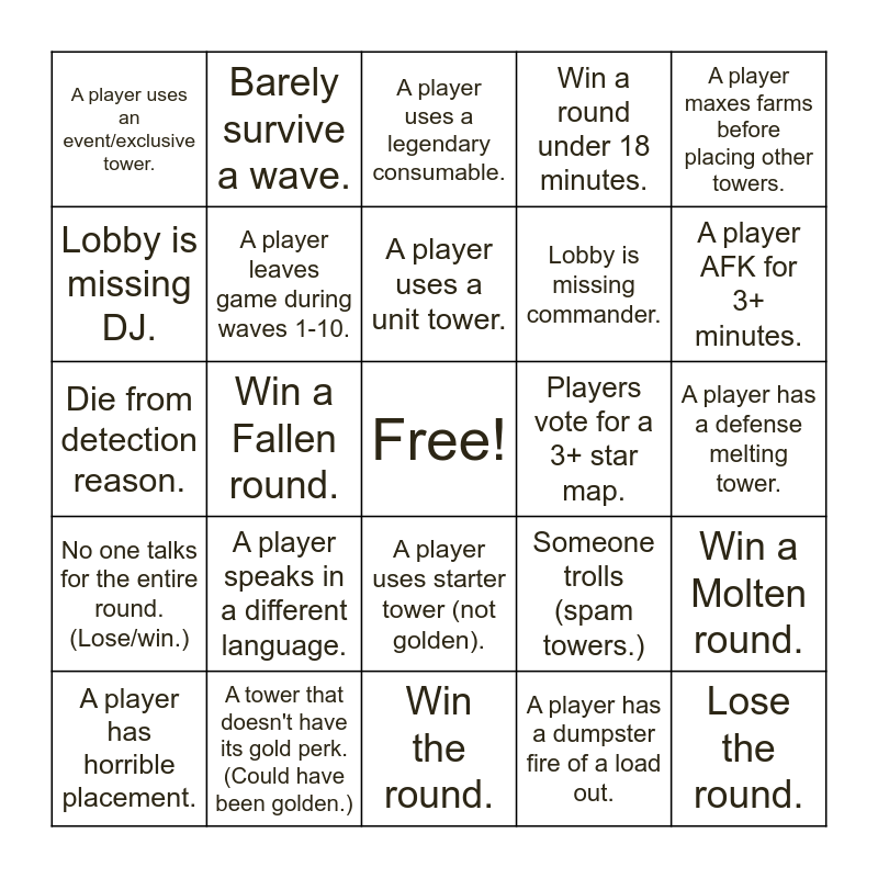 This bingo card has a free space and 34 words: Die last wave., A player has a dumpster fire of a load out., No one defends for early game., Players bring the same support tower., No one talks for the entire round. (Lose/win.), A player leaves game during waves 1-10., A player maxes farms before placing other towers., A player has horrible placement., Barely survive a wave., A player uses a consumable., A player uses a unit tower., A player uses a legendary consumable., A player doesn't load in., A player asks for a specific request., Players vote for a 3+ star map., A player AFK for 3+ minutes., A tower that doesn't have its gold perk. (Could have been golden.), Die from detection reason., A player speaks in a different language., Someone trolls (spam towers.), A player uses starter tower (not golden)., 2021 or older skin., A player uses an event/exclusive tower., A player has a defense melting tower., Win the round., Lose the round., Win a round under 18 minutes., Game tweaks out., Lobby is missing commander., Lobby is missing DJ., Win with full health (can be healed.), Win a Fallen round., Win a Molten round. and Encounter an argument (Not created by you but can be in one.).