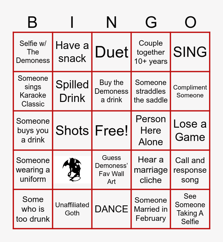 This bingo card has 1 images, a free space and 24 words: DANCE, Buy the Demoness a drink, Some who is too drunk, SING, Selfie w/ The Demoness, Someone sings Karaoke Classic, Have a snack, Person Here Alone, Guess Demoness’ Fav Wall Art, Someone straddles the saddle, Someone buys you a drink, Hear a marriage cliche, Call and response song, Spilled Drink, Win a Game, Lose a Game, Duet, Compliment Someone, Shots, See Someone Taking A Selfie, Unaffiliated Goth, Someone wearing a uniform, Couple together 10+ years and Someone Married in February.