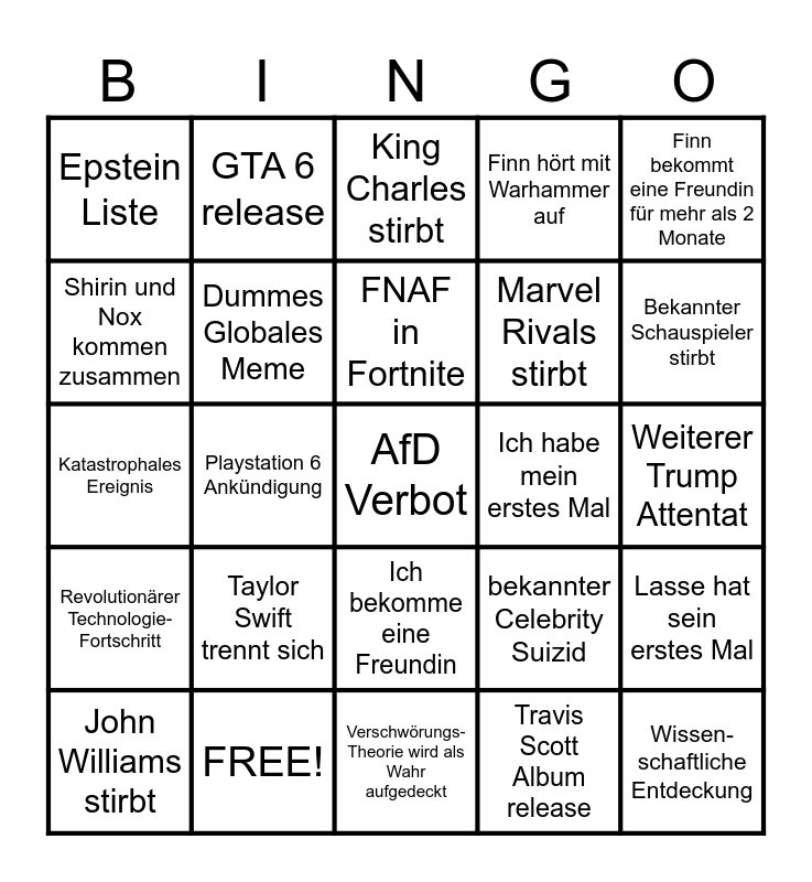This bingo card has a free space and 24 words: John Williams stirbt, Taylor Swift trennt sich, FNAF in Fortnite, Travis Scott Album release, Finn bekommt eine Freundin für mehr als 2 Monate, Epstein Liste, GTA 6 release, King Charles stirbt, Ich habe mein erstes Mal, Weiterer Trump Attentat, Katastrophales Ereignis, Dummes Globales Meme, bekannter Celebrity Suizid, Lasse hat sein erstes Mal, Shirin und Nox kommen zusammen, FREE!, Verschwörungs-Theorie wird als Wahr aufgedeckt, Finn hört mit Warhammer auf, Bekannter Schauspieler stirbt, Revolutionärer Technologie-Fortschritt, Playstation 6 Ankündigung, Ich bekomme eine Freundin, Marvel Rivals stirbt and Wissen-schaftliche Entdeckung.
