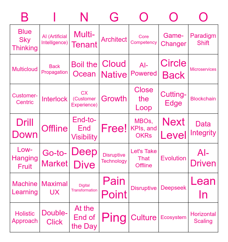 This bingo card has a free space and 72 words: Agile, AI (Artificial Intelligence), AI-Powered, AI-Driven, Actionable Insights, Algorithm, Architect, At the End of the Day, Back Propagation, Big Data, Blockchain, Bleeding-Edge, Boil the Ocean, Blue Sky Thinking, Cloud-Based, Cloud Native, Close the Loop, Core Competency, Culture, Customer-Centric, CX (Customer Experience), Circle Back, Cutting-Edge, Data Integrity, Deep Dive, Deepseek, Digital Transformation, Disruptive, Disruptive Technology, Double-Click, Drill Down, Ecosystem, Energy, End-to-End Solution, End-to-End Visibility, Evolution, Fail Forward, Future Proofing, Game-Changer, Go-to-Market, Growth, Horizontal Scaling, Holistic Approach, Ideation, Innovation, Interlock, Low-Hanging Fruit, Lean In, License Agreement, Let's Take That Offline, Machine Learning, Manifest, Maximal UX, Microservices, MBOs, KPIs, and OKRs, Momentum, Multi-Tenant, Multicloud, Net-Net, Neural Networks, No Change, NoOps, Next Level, Offline, Out-of-the-Box Thinking, Pain Point, Paradigm Shift, Ping, Predictive Analytics, Prescriptive, Quantum Computing and Resilience.